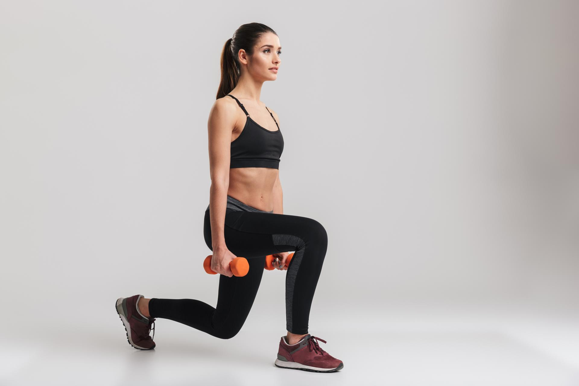 Stanite uspravno, stopala su u širini kukova. U svakoj ruci držite bučicu, ruke su ispružene uz tijelo, dlanovi okrenuti prema bedrima. Leđa su ravna, prsa isturena, pogled je ravno naprijed. Zakoračite jednom nogom prema naprijed i spuštajte se kontrolirano dok oba koljena ne formiraju kut od 90 stupnjeva. Prednje koljeno ne smije prelaziti prste stopala. Stražnje koljeno ide prema podu, ali ga ne dodiruje. Potom se prednjim stopalom odgurnite i vratite u početni položaj. Udah je pri spuštanju, izdah pri povratku u početni položaj.