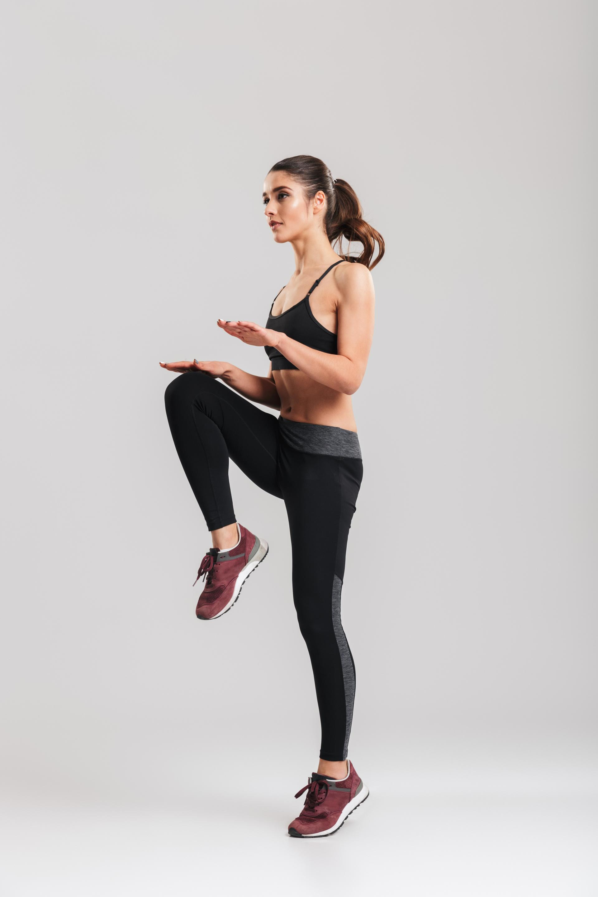 Stanite uspravno, s nogama u širini kukova ili malo šire, leđa su ravna, pogled usmjeren naprijed. Mišiće trupa držite aktivnima radi stabilnosti. Podignite jedno koljeno što više možete, ciljajte na razinu kukova ili više, dok istovremeno suprotna ruka ide prema naprijed u pokretu ljuljanja. Zatim izmijenite nogu i ruku. Povećajte brzinu i intenzitet za bolji učinak na srce i krvne žile. Možete držati lagane utege radi dodatnog otpora. Vježbu radite 30 sekundi, zatim pauza 30 sekundi. Ponovite u 2-3 seta.